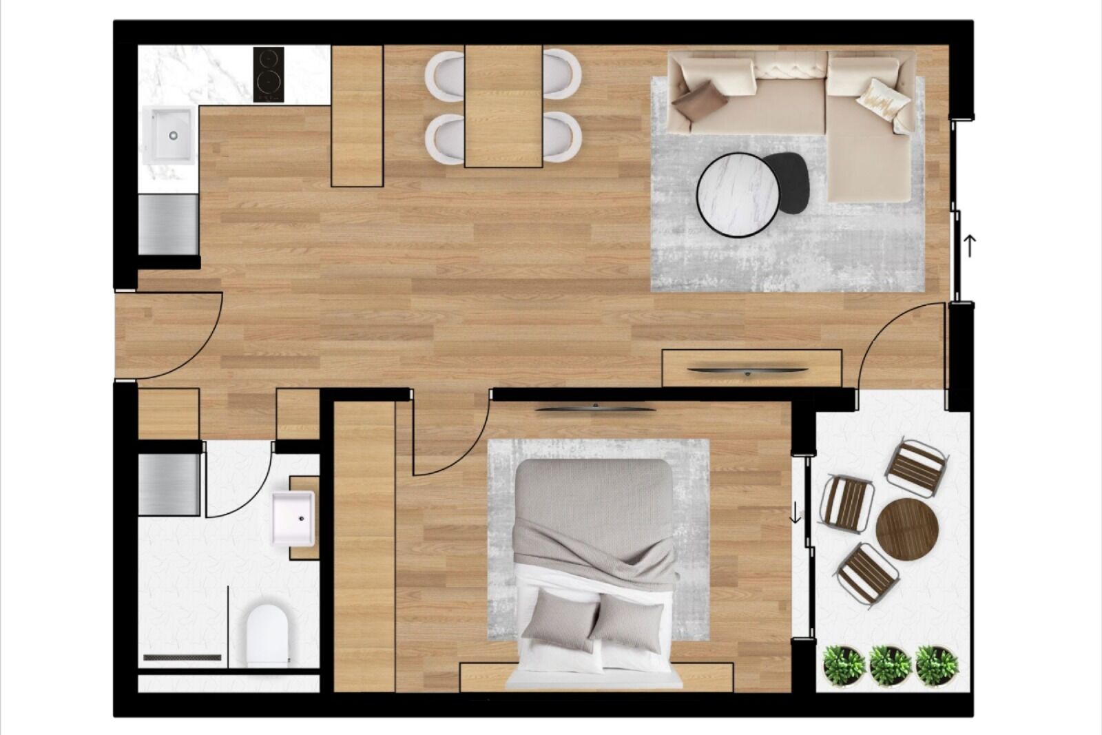 The construction will be completed at the end of this year, and the apartments will be delivered in the last quarter of 2026. A 40% down payment is available, with the remainder paid in 12 monthly installments.