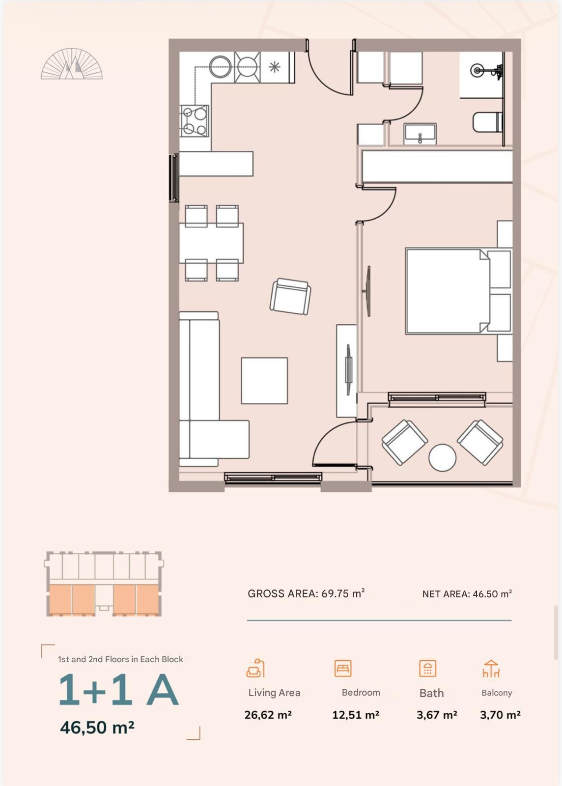 The building has 3 floors: Garden floor, 1st floor, and 2nd floor. There are two types of one-bedroom apartments: balcony plans and garden plans. All one-bedroom apartment plans on each floor are the same. Only the view and the goodwill vary. The advertised price is for the one-bedroom apartment 46,5 m2 on the 1st floor of Block B. If you're looking for a different apartment, please call us to inquire.
