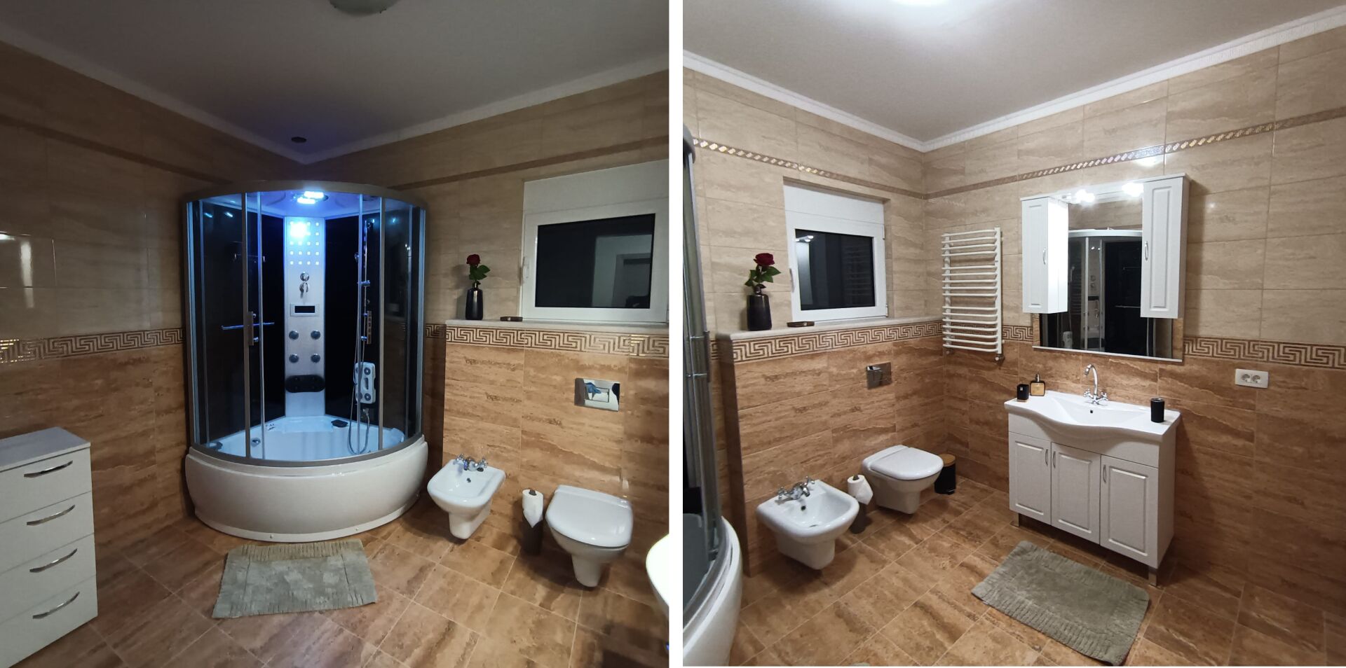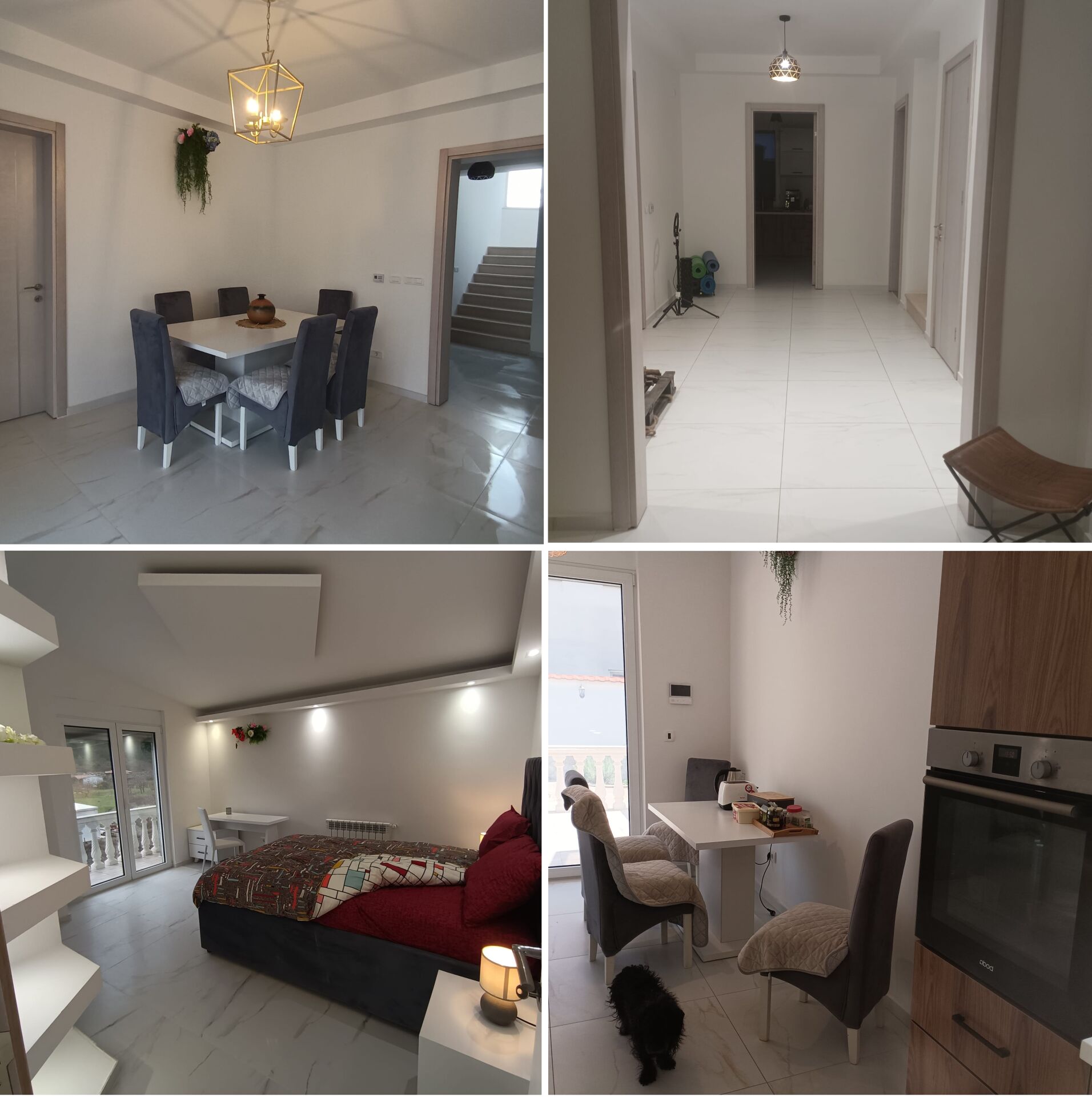 The house was completely renovated three years ago. It has 5 bedrooms, 2+1 bathrooms, large living room and separate kitchen. Garden and swimming pool with garage and storage area (direct access to WC and bathroom). The house is on two floors. 1st floor: 2 terraces (north and east). 2nd floor: 2 terraces and a balcony.